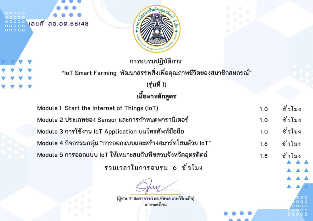 ♦️หน้าที่ของกรรมการสหกรณ์ตามวัตถุประสงค์อำนาจกระทำการตามหลักการสหกรณ์เพื่อการกินดีอยู่ดี 💛สหกรณ์สนับสนุนให้พัฒนาอาชีพสมาชิกให้มีรายได้ลดค่าใช้จ่าย🔵ในการนี้จึงจัดการ“ อบรมเชิงปฏิบัติการ IoT Smart Farming พัฒนาสรรพสิ่งเพื่อคุณภาพชีวิตของสมาชิกสหกรณ์” ในวันเสาร์ที่ 18 ตุลาคม 2568 เวลา 8.00 -17.00 น. หลักสูตร 9 ชั่วโมง รับจำนวน 50 คน กรอกใบสมัครตามลิงค์ที่ส่งให้นี้นะครับ