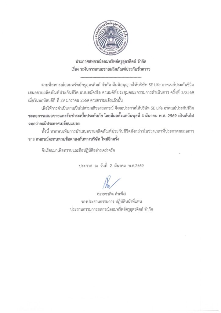 Posted inประกาศสหกรณ์ฯทั่วไป ประกาศชะลอการเสนอขายและรับชำระเบี้ยประกันภัยบริษัท SE Life อาคเนย์ประกันชีวิต Posted by By sakutd 4 มีนาคม 2026No Comments ประกาศชะลอการเสนอขายและรับชำระเบี้ยประกันภัยบริษัท SE Life อาคเนย์ประกันชีวิตตั้งแต่วันที่ 4 มีนาคม พ.ศ. 2569 เป็นต้นไป sakutd View All Posts Post navigation Previous Post Valentine’s Cashback Secrets: How to Maximize Love‑Day Rewards at Casino Slots N BetsNext PostMastering the Luckypays Casino Experience: Data‑Driven Insights for Modern Players