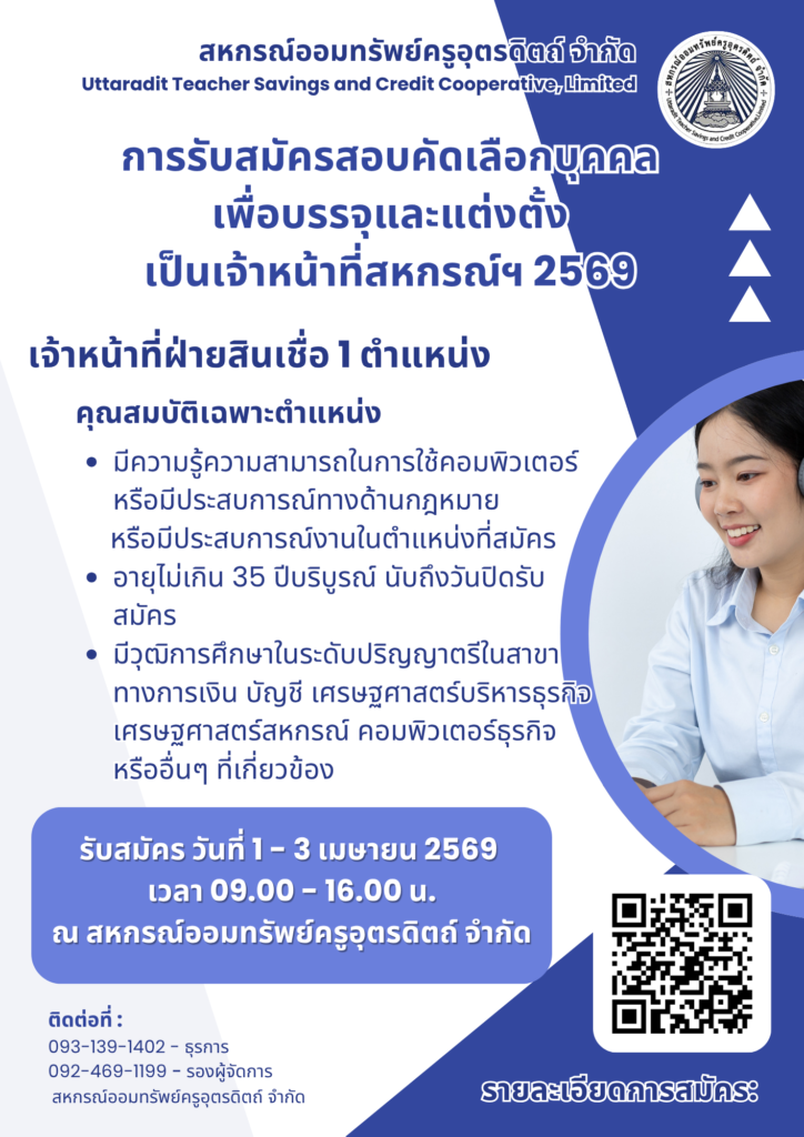 (2). สหกรณ์เปิดรับสมัครและสอบคัดเลือก “เจ้าหน้าที่สินเชื่อ1ตำแหน่ง “