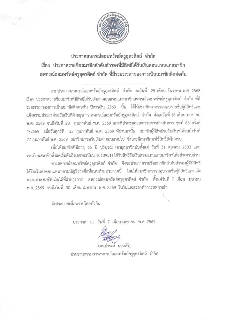 รายชื่อสมาชิกลำดับสำรองที่มีสิทธิได้รับเงินตอบแทนแก่สมาชิกสหกรณ์ออมทรัพย์ครูอุตรดิตถ์ จำกัด ที่มีระยะเวลาของการเป็นสมาชิกติดต่อกัน